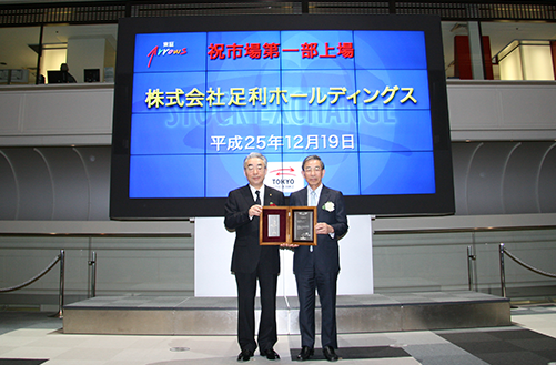 当行は、東京証券取引所への早期の株式上場を経営目標に定め、達成に向け役職員一丸となって取り組みました。その結果、2013年12月19日に(株)足利ホールディングスの東京証券取引所市場第一部上場が実現しました。