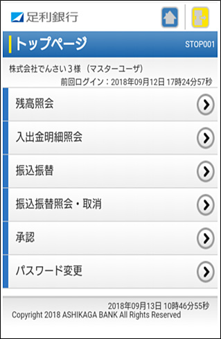 法人インターネットバンキングの機能の一部を、スマートフォンからでも操作可能とした画面です。