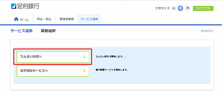 - 法人インターネットバンキングにログインし、「サービス連携」ボタンから「でんさい取引へ」をクリックします。
