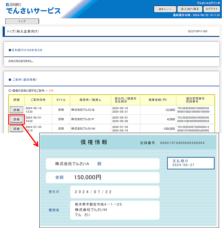 - トップ(納入企業向け)画面にある「ご案内(通知情報)」の「詳細」をクリックすると手形イメージでの債権内容が確認できます。