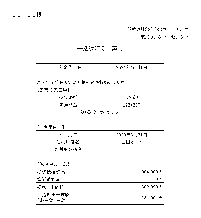 一括返済日は1ヵ月程度先の日付としてください。
