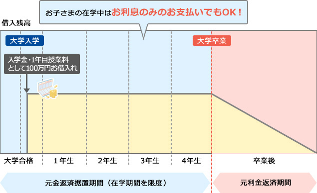 - お子さまの在学期間中は利息のみのご返済いただきます。