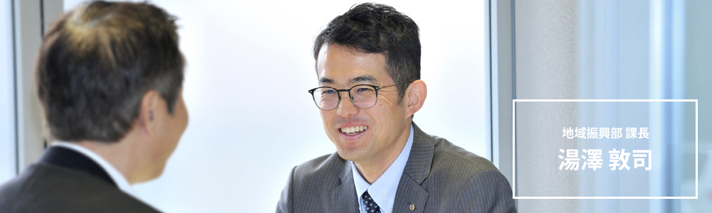 ビジネスマッチングは文字通り、商売と商売を引き合わせる仕事です。営業店から本部の営業推進部へ上がってくるお客さまの販路拡大や商品開発、事業の合理化、人材不足など、さまざまな経営課題を解決するために、当行のお取引先企業をビジネスパートナーとしてご紹介します。地場商品を売り込みたい食品加工業者に、取扱商品を拡充させたい百貨店やスーパーをご紹介したり、流通システムを強化したいメーカーに物流会社をご紹介するなど、課題を抱えているお客さまと、その課題解決のために紹介するお客さま双方をWin-Winの関係に導く仲介役のような立場です。ビジネスパートナーを探している企業は時間的に余裕のない場合が多く、新鮮で適確な情報を迅速に提供しなければなりません。大量の情報を精査して、営業店の担当者が自分のお客さまに合う情報を見つけやすく、そして届けやすくする必要があります。地域に密着した当行は、業種業界を問わず地元企業の豊富なデータを蓄積しており、加えて経営統合している常陽銀行と連携することで、北関東の広域エリアに跨ったマッチングが可能となり、紹介企業の幅も広がっています。弱点を補い合い、長所を強化できる有効なマッチングを成立させることで地元企業をより元気にできる仕事です。