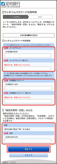 - スマートフォンのメールアドレス、お客さま任意の利用開始パスワード(半角数字4~8桁)、秘密の質問・回答を入力し[確定する]ボタンをタップしてください。