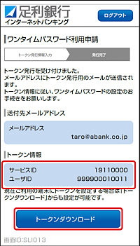 - トークン情報(サービスID、ユーザーID)を控えて、[トークンダウンロード]ボタンをタップしてください。