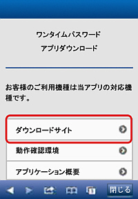 - [ダウンロードサイト]ボタンをタップすると、App Store・Google Playに遷移しますので、サイトの指示に従ってワンタイムパスワードアプリをダウンロードしてください。