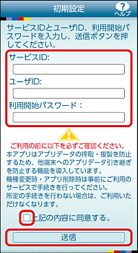 - ワンタイムパスワード利用申請画面で控えた、トークン情報(サービスID、ユーザーID)および利用開始パスワードを入力してください。