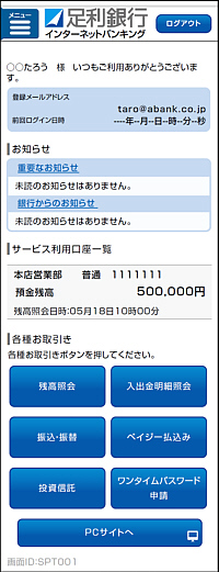- インターネットバンキング(トップページ)が表示されますので、ご希望のお取引きを選択し、各種サービスをご利用ください。