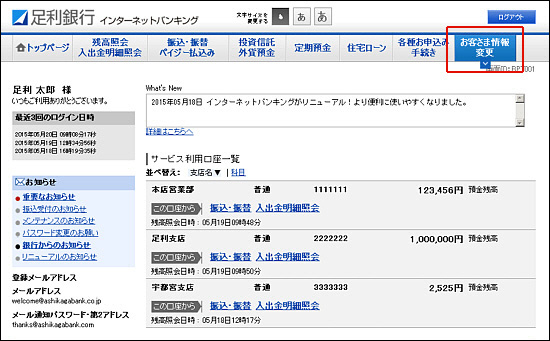 - 1.インターネットバンキングサービスにログインして、メニュー画面の[お客さま情報変更]をクリックしてください。