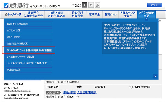 - 2.項目一覧が表示されるので[ワンタイムパスワード申請・利用解除・取引認証]をクリックします。