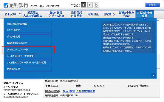 - 項目一覧が表示されるので[ワンタイムパスワード申請]をクリックします。