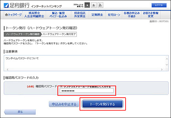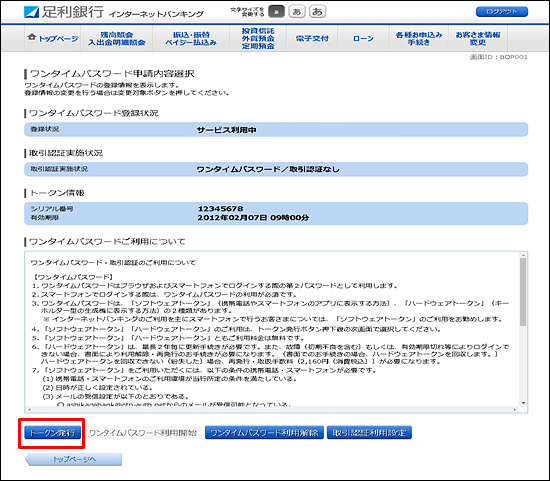 - 「ワンタイムパスワードご利用について」を確認し[トークン発行]をクリックしてください。
