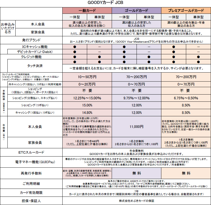 | ご利用可能枠とお支払方法 | QUICPayでのご利用分は、GOODYカードのショッピングご利用分と合算され、本人カードのご利用可能枠でご利用いただけます。また、お支払方法は本人カードに準じた設定となります。 |